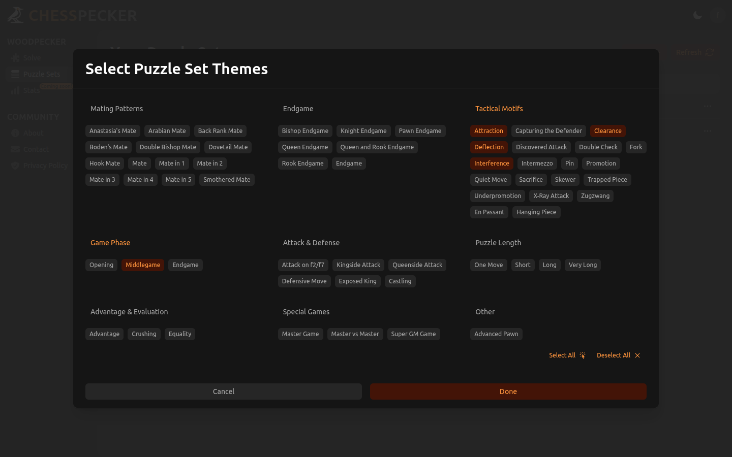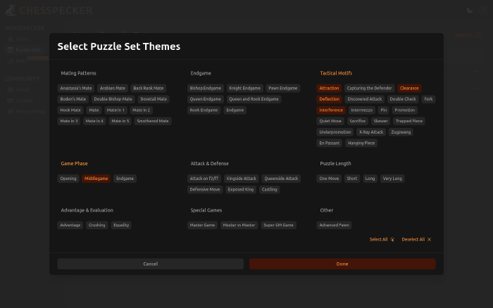 In ChessPecker, you can create your own set of puzzles with different puzzle counts, average puzzle ratings, number of cycles, and puzzle themes.